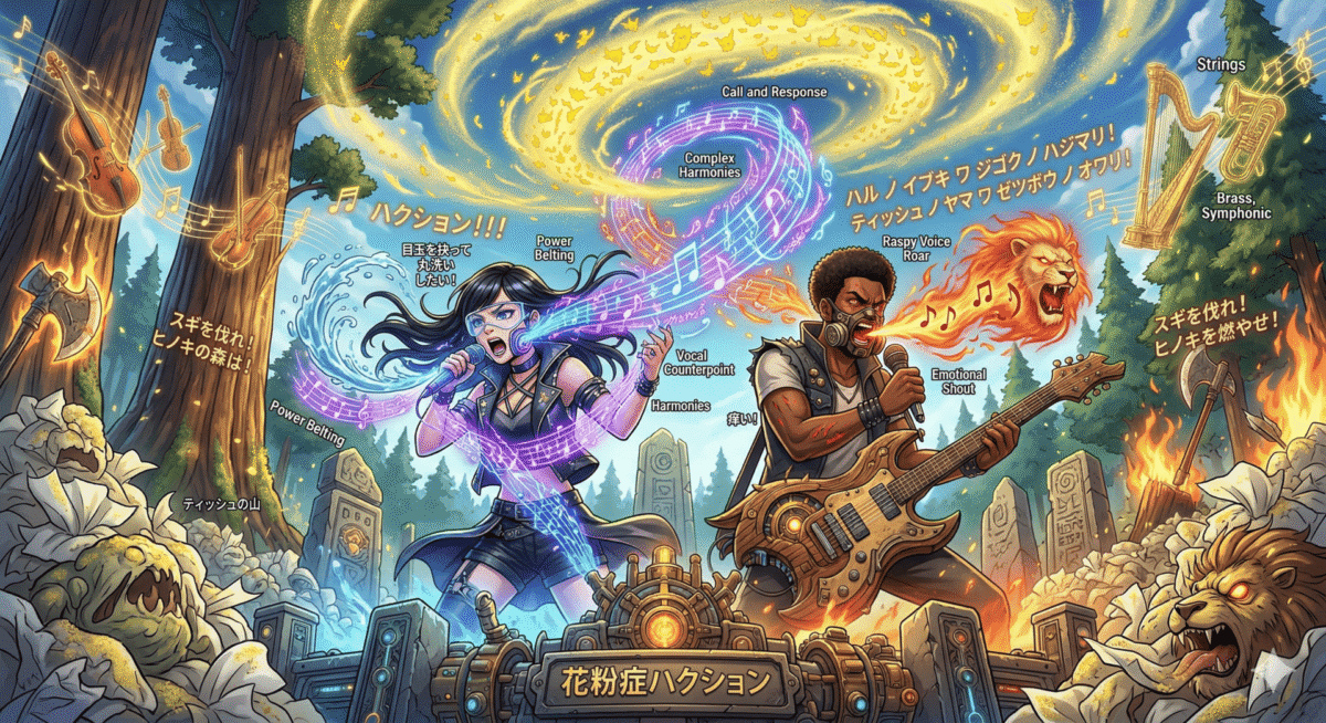 毎年春になると、日本全土を襲う「黄色い悪魔(スギ・ヒノキ花粉)」。 そんな花粉症患者たちが抱える果てしない絶望と怒りを、アニメの最終決戦レベルの【超壮大なアニソン風ロック】に乗せて叫び上げた魂のデュエットです。