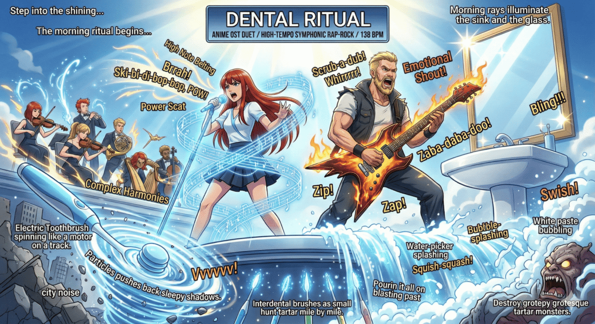 “DENTAL RITUAL” is a ridiculously dramatic Symphonic Rap-Rock anthem featuring aggressive rap, high-speed scatting, and a passionate “onomatopoeia battle” (Scrub! Swish! Spit!). Listen as the electric toothbrush, interdental brushes, and water-picker become the ultimate weapons to annihilate plaque and tartar.